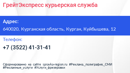 ГрейтЭкспресс, курьерская служба по адресу 640020, Курганская область, Курган, Куйбышева, 12 в дальнейшем Организация, размещена в следующих категориях:
