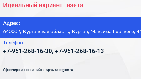 Идеальный вариант, газета по адресу 640002, Курганская область, Курган, Максима Горького, 41 в дальнейшем Организация, размещена в следующих категориях: