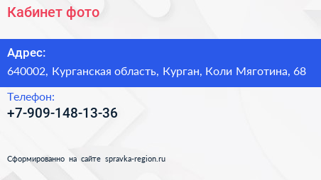 Кабинет фото по адресу 640002, Курганская область, Курган, Коли Мяготина, 68 в дальнейшем Организация, размещена в следующих категориях: