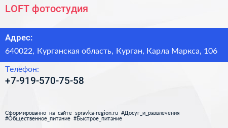LOFT, фотостудия по адресу 640022, Курганская область, Курган, Карла Маркса, 106 в дальнейшем Организация, размещена в следующих категориях: