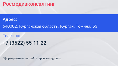 Росмедиаконсалтинг по адресу 640002, Курганская область, Курган, Томина, 53 в дальнейшем Организация, размещена в следующих категориях: