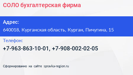 СОЛО, бухгалтерская фирма по адресу 640018, Курганская область, Курган, Пичугина, 15 в дальнейшем Организация, размещена в следующих категориях: