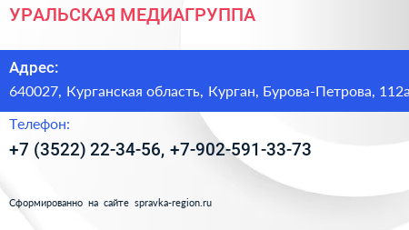 УРАЛЬСКАЯ МЕДИАГРУППА по адресу 640027, Курганская область, Курган, Бурова-Петрова, 112а в дальнейшем Организация, размещена в следующих категориях: