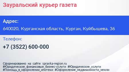 Зауральский курьер, газета по адресу 640020, Курганская область, Курган, Куйбышева, 36 в дальнейшем Организация, размещена в следующих категориях: