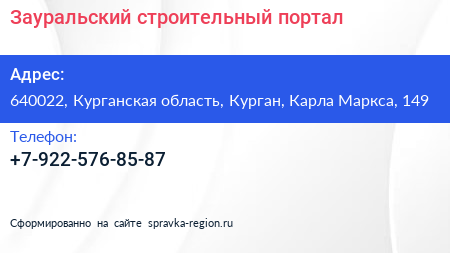 Зауральский строительный портал по адресу 640022, Курганская область, Курган, Карла Маркса, 149 в дальнейшем Организация, размещена в следующих категориях: