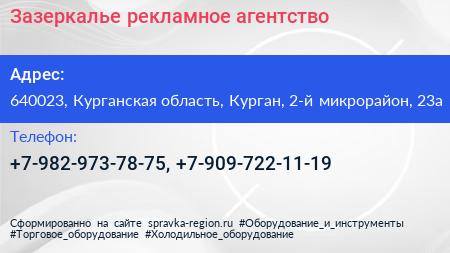 Зазеркалье, рекламное агентство по адресу 640023, Курганская область, Курган, 2-й микрорайон, 23а в дальнейшем Организация, размещена в следующих категориях: