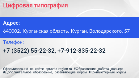 Цифровая типография по адресу 640002, Курганская область, Курган, Володарского, 57 в дальнейшем Организация, размещена в следующих категориях: