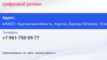 Цифровой регион по адресу 640027, Курганская область, Курган, Бурова-Петрова, 112а в дальнейшем Организация, размещена в следующих категориях: