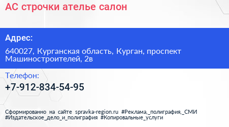 АС строчки, ателье-салон по адресу 640027, Курганская область, Курган, проспект Машиностроителей, 2в в дальнейшем Организация, размещена в следующих категориях: