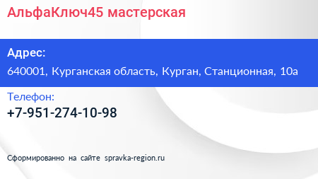 АльфаКлюч45, мастерская по адресу 640001, Курганская область, Курган, Станционная, 10а в дальнейшем Организация, размещена в следующих категориях: