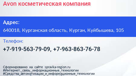 Avon, косметическая компания по адресу 640018, Курганская область, Курган, Куйбышева, 105 в дальнейшем Организация, размещена в следующих категориях: