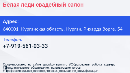 Белая леди, свадебный салон по адресу 640001, Курганская область, Курган, Рихарда Зорге, 54 в дальнейшем Организация, размещена в следующих категориях: