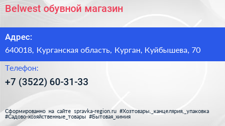 Belwest, обувной магазин по адресу 640018, Курганская область, Курган, Куйбышева, 70 в дальнейшем Организация, размещена в следующих категориях: