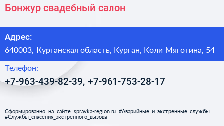 Бонжур, свадебный салон по адресу 640003, Курганская область, Курган, Коли Мяготина, 54 в дальнейшем Организация, размещена в следующих категориях: