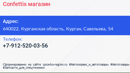 Confettis, магазин по адресу 640022, Курганская область, Курган, Савельева, 54 в дальнейшем Организация, размещена в следующих категориях: