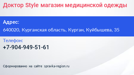 Доктор Style, магазин медицинской одежды по адресу 640020, Курганская область, Курган, Куйбышева, 35 в дальнейшем Организация, размещена в следующих категориях: