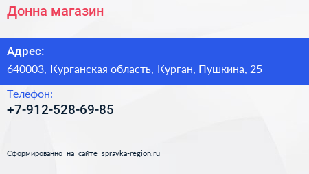 Донна, магазин по адресу 640003, Курганская область, Курган, Пушкина, 25 в дальнейшем Организация, размещена в следующих категориях: