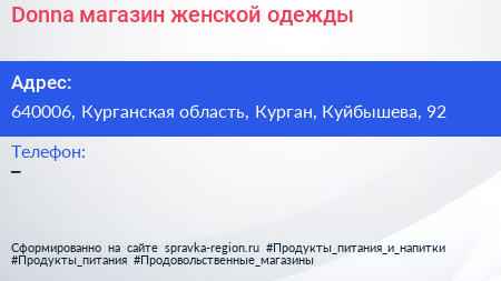Donna, магазин женской одежды по адресу 640006, Курганская область, Курган, Куйбышева, 92 в дальнейшем Организация, размещена в следующих категориях: