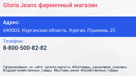 Gloria Jeans, фирменный магазин по адресу 640003, Курганская область, Курган, Пушкина, 25 в дальнейшем Организация, размещена в следующих категориях: