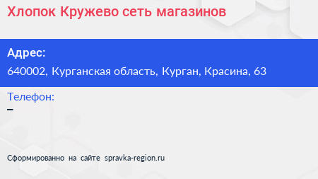 Хлопок & Кружево, сеть магазинов по адресу 640002, Курганская область, Курган, Красина, 63 в дальнейшем Организация, размещена в следующих категориях: