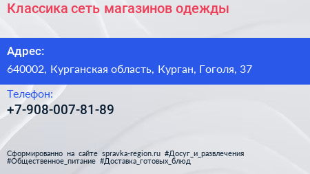 Классика, сеть магазинов одежды по адресу 640002, Курганская область, Курган, Гоголя, 37 в дальнейшем Организация, размещена в следующих категориях: