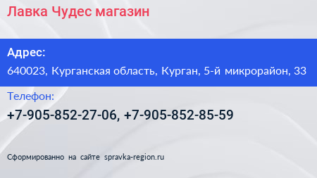 Лавка Чудес, магазин по адресу 640023, Курганская область, Курган, 5-й микрорайон, 33 в дальнейшем Организация, размещена в следующих категориях: