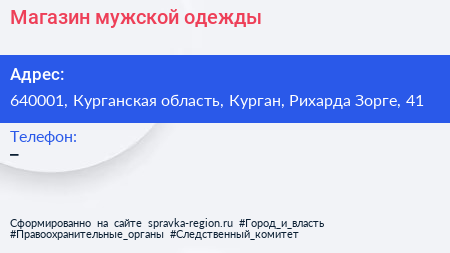 Магазин мужской одежды по адресу 640001, Курганская область, Курган, Рихарда Зорге, 41 в дальнейшем Организация, размещена в следующих категориях: