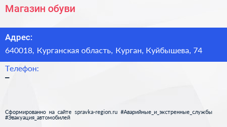 Магазин обуви по адресу 640018, Курганская область, Курган, Куйбышева, 74 в дальнейшем Организация, размещена в следующих категориях: