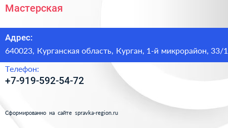 Мастерская по адресу 640023, Курганская область, Курган, 1-й микрорайон, 33/1 в дальнейшем Организация, размещена в следующих категориях: