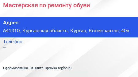 Мастерская по ремонту обуви по адресу 641310, Курганская область, Курган, Космонавтов, 40в в дальнейшем Организация, размещена в следующих категориях: