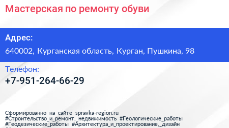 Мастерская по ремонту обуви по адресу 640002, Курганская область, Курган, Пушкина, 98 в дальнейшем Организация, размещена в следующих категориях: