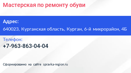 Мастерская по ремонту обуви по адресу 640023, Курганская область, Курган, 6-й микрорайон, 4Б в дальнейшем Организация, размещена в следующих категориях: