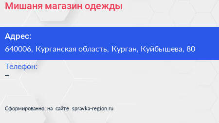 Мишаня, магазин одежды по адресу 640006, Курганская область, Курган, Куйбышева, 80 в дальнейшем Организация, размещена в следующих категориях: