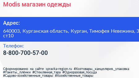 Modis, магазин одежды по адресу 640003, Курганская область, Курган, Тимофея Невежина, 3 ст10 в дальнейшем Организация, размещена в следующих категориях: