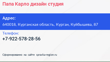 Папа Карло, дизайн-студия по адресу 640018, Курганская область, Курган, Куйбышева, 87 в дальнейшем Организация, размещена в следующих категориях:
