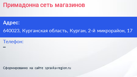 Примадонна, сеть магазинов по адресу 640023, Курганская область, Курган, 2-й микрорайон, 17 в дальнейшем Организация, размещена в следующих категориях: