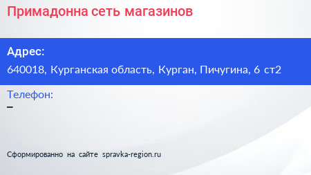 Примадонна, сеть магазинов по адресу 640018, Курганская область, Курган, Пичугина, 6 ст2 в дальнейшем Организация, размещена в следующих категориях: