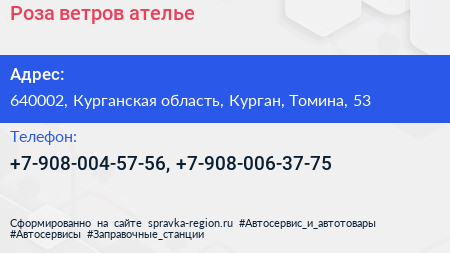 Роза ветров, ателье по адресу 640002, Курганская область, Курган, Томина, 53 в дальнейшем Организация, размещена в следующих категориях: