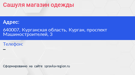 Сашуля, магазин одежды по адресу 640007, Курганская область, Курган, проспект Машиностроителей, 3 в дальнейшем Организация, размещена в следующих категориях:
