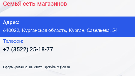 СемьЯ, сеть магазинов по адресу 640022, Курганская область, Курган, Савельева, 54 в дальнейшем Организация, размещена в следующих категориях: