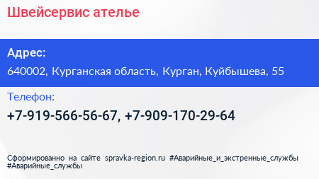 Швейсервис, ателье по адресу 640002, Курганская область, Курган, Куйбышева, 55 в дальнейшем Организация, размещена в следующих категориях: