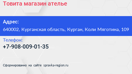 Товита, магазин-ателье по адресу 640002, Курганская область, Курган, Коли Мяготина, 109 в дальнейшем Организация, размещена в следующих категориях: