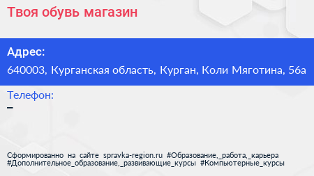 Твоя обувь, магазин по адресу 640003, Курганская область, Курган, Коли Мяготина, 56а в дальнейшем Организация, размещена в следующих категориях: