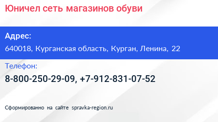 Юничел, сеть магазинов обуви по адресу 640018, Курганская область, Курган, Ленина, 22 в дальнейшем Организация, размещена в следующих категориях: