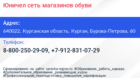 Юничел, сеть магазинов обуви по адресу 640022, Курганская область, Курган, Бурова-Петрова, 60 в дальнейшем Организация, размещена в следующих категориях: