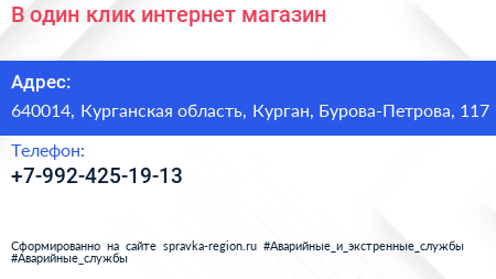 В один клик, интернет-магазин по адресу 640014, Курганская область, Курган, Бурова-Петрова, 117 в дальнейшем Организация, размещена в следующих категориях: