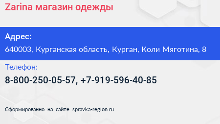 Zarina, магазин одежды по адресу 640003, Курганская область, Курган, Коли Мяготина, 8 в дальнейшем Организация, размещена в следующих категориях: