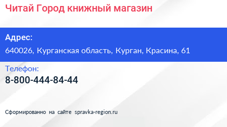 Читай-Город, книжный магазин по адресу 640026, Курганская область, Курган, Красина, 61 в дальнейшем Организация, размещена в следующих категориях: