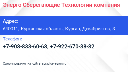 Энерго Сберегающие Технологии, компания по адресу 640011, Курганская область, Курган, Декабристов, 3 в дальнейшем Организация, размещена в следующих категориях:
