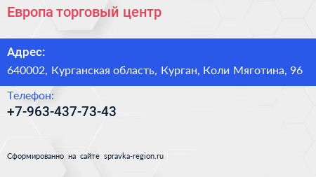 Европа, торговый центр по адресу 640002, Курганская область, Курган, Коли Мяготина, 96 в дальнейшем Организация, размещена в следующих категориях: